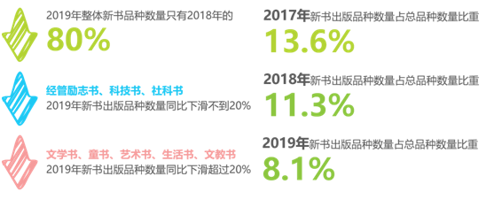 报告显示,2017年中国图书出版种数(包括新版图书和当年重印图书)突破50万种,2018年达51.9万种,同比增长1.3%。2017年至2018年图书出版种数保持增长,但其中重印图书品种在上升,新版图书品种在下降。而在2019年,新书出版品种数量持续下降,只有2018年的80%。