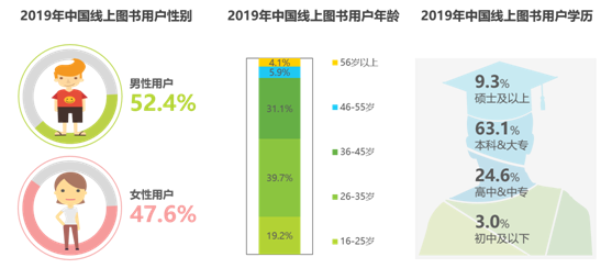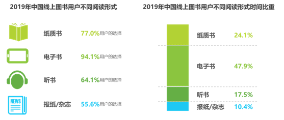 根据报告的调研内容,2019年中国线上图书用户不同阅读形式中,电子书占94.1%,纸书占77.0%,听书占64.1%,55.6%会阅读报纸/杂志。国民阅读习惯的改变,推动了整个图书市场向线上化、数字化、智能化转变,数字阅读已成为主流阅读方式。