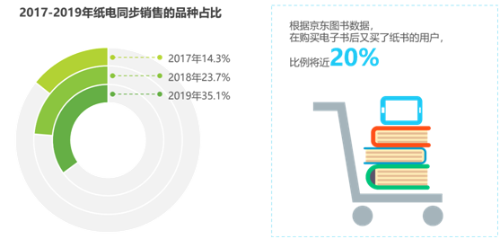 报告显示,一本书同时有纸书和电子书两个出版形式变得越来越普遍,“纸电同步”销售的品种占比越来越高:从2017年的14.3%,到2018年的23.7%,到2019年已经超过35%。同时,有近20%的用户,在购买电子书后又买了纸质书。