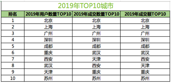根据报告数据,在2019年无论是用户数量,还是成交数量和成交额,北京、上海、广州、深圳、成都五座城市都排在前列。