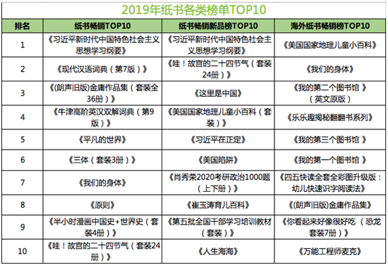 2019年纸书榜中,《习近平新时代中国特色社会主义思想学习纲要》名列第一。每年党政纲要新书上市都会一定程度带动图书市场销量增长; 《哇!故宫的二十四节气》作为新书也有上好表现。多数上榜书都是经典长销书,如《现代汉语词典》《平凡的世界》《三体》和《原则》连续两年上榜。