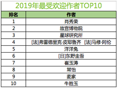 在京东图书2019年最受欢迎作者TOP10中,排名第一的是肖秀荣,每年数以百万考研大军撑起了其在图书界的霸主地位。此外,随着故宫博物院爆红,以《故宫日历》、《哇!故宫的二十四节气》为代表的故宫文创产品也越发受到喜爱而登上榜单。星球研究所也凭借着2019年爆款书《这里是中国》成为书界网红。