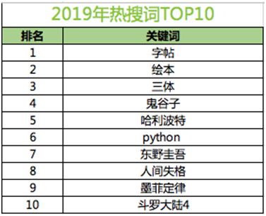 从京东图书2019年搜索热词来看,用户更加偏好精准搜索。热搜词TOP10中,6个是具体书名,python是具体名词,东野圭吾是具体作者,只有字帖和绘本是图书类目。