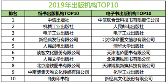 2019年纸书出版机构TOP10中,中信出版社和机械工业出版社与2018年排名一样,位居榜单第一和第二名。2018年排名第四的电子工业出版社今年排名上升一位,进入前三。读客文化股份有限公司2019年新晋入榜。机械工业出版社、电子工业出版社、人民邮电出版社均属于科技大社。随着AI、5G、区块链、VR、智能家居等科技领域日益受到关注,科技类图书市场将不断扩大。