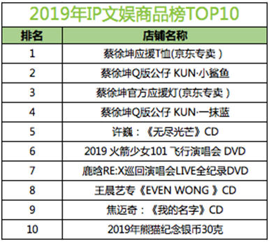 2019年京东文娱上线了鹿晗、蔡徐坤等多款京东专卖的明星周边产品。其中,鹿晗演唱会DVD限量7777套9秒售罄;蔡徐坤公仔和T恤上线7分钟销售额突破500万元;蔡徐坤应援灯8秒售罄8000个。这些中国文娱产品销售领域的现象级项目,引发行业和用户对京东文娱更多期待。从榜单看,用户对明星周边商品的需求,不仅集中传统品类,未来将是多元化需求。
