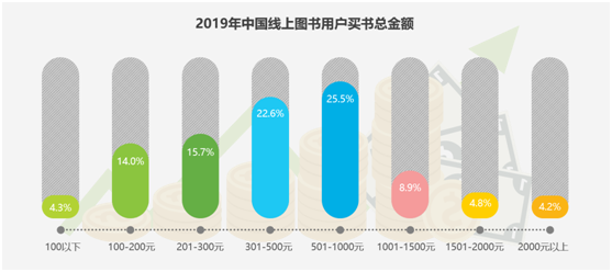 从报告的调研结果看,2019年线上买书用户中,金额在501-1000元的用户最多,占比25.5%,另有22.6%的用户买书金额在301-500元。此外,2019年对比2018年,52.9%用户买书数量增加,31.8%用户买书数量持平;买书数量在4-10本之间的用户数最多,占比过半;还有14.6%的用户购买了20本以上图书。