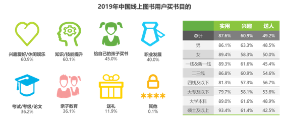 报告显示,中国图书网购消费者购书目的可分三大类,分别是实用、兴趣和送人。