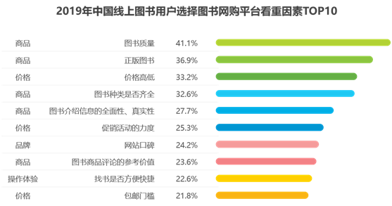 根据报告内容,线上图书用户中,相对价格,用户更看重平台、品牌、服务:46.0%的用户认为某些平台、品牌的品质和服务更好,价格贵点也没关系,44.8%的用户愿意为更好的服务支付更多的金钱。在用户选择图书网购平台的看重因素前十项中,图书质量是用户最看重的,占比41.1%;此外,36.9%的用户看重正版图书,33.2%的用户看重价格高低;32.6%的用户看重图书种类是否齐全。这要求线上图书平台既要做好选品和质量把控,又要尽可能地给消费者让利。京东图书之所以获得读者的广泛认可,与多年来不断深耕细作有直接关系。
