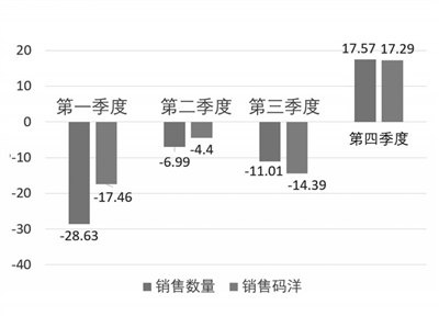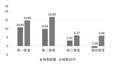 2019年线上市场销售持续上扬,由于承担的销售品类涉及主题图书不多,因此主题图书超常销售不再对其基本没有影响。从销售同比看,线上市场4个季度销售码洋均增,上半年增幅均为2位数,下半年增幅均为1位数。销售数量前3个季度均告增长,只是增幅呈降势,从2位数逐季降至1位数,至第4季度出现1.08%的同比下降(见图3)。