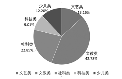 2019年线下实体书店销售细分市场结构为:文教类比重居首,占42.78%;社科类比重次之,占22.85%;文艺类、少儿类比重接近,前者占13.16%,后者占12.20%;科技类比重最小,占9.01%(见图2)。与上年相比,各细分市场比重排序相同,文教类、少儿类销售增长,比重扩大;社科类、文艺类、科技类销售下降,比重缩小。