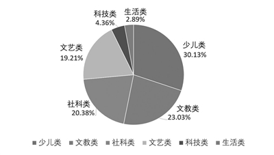 2019年线上网店销售细分市场结构为:少儿类比重居首,占30.13%;文教类比重次之,占23.03%;社科类、文艺类比重接近,前者占20.38%,后者占19.21%;科技类、生活类比重偏小,前者占4.36%,后者占2.89%(见图4)。与上年相比,各细分市场比重排序相同,各大类销售均告增长:少儿、社科、科技三类细分市场比重扩大,文教、文艺、生活三类细分市场比重缩小。