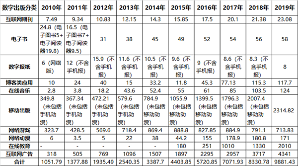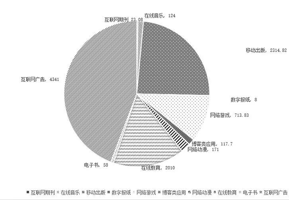 其中:互联网期刊收入23.08亿元,电子书58亿元,数字报纸(不含手机报)8亿元,博客类应用117. 7亿元,在线音乐124亿元,网络动漫171亿元,移动出版(移动阅读、移动音乐、移动游戏等)2314.82亿元,网络游戏713.83亿元,在线教育2010亿元,互联网广告达4341亿元。