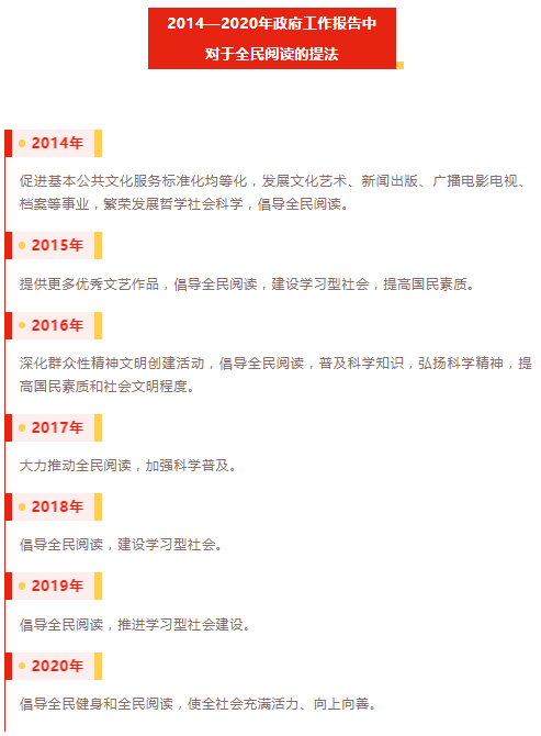这是自2014年起,“全民阅读”连续第八次写入政府工作报告。