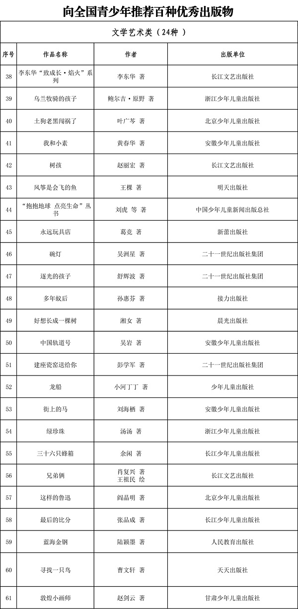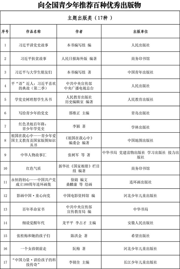 经过论证评选,最终确定向青少年推荐《习近平与大学生朋友们》《红色气质》《大家小书青春版》《藏在典籍里的中华美德》《乌兰牧骑的孩子》《我和小素》《征程:人类探索太空的故事》《给孩子讲大数据/人工智能》《美丽中国·从家乡出发》《童心战“疫”·大眼睛暖心绘本》《红游记》《中华传统文化名家课堂音频库》等100种精品出版物,内容涵盖宣传阐释习近平新时代中国特色社会主义思想,深化党史学习教育和“四史”学习教育,践行社会主义核心价值观,弘扬中华优秀传统文化,培育美育素质,培养科学精神等方面。这些作品具有较强的思想性、艺术性、可读性,符合青少年认知规律和阅读特点,是近年来我国青少年读物原创出版成果的集中体现。
