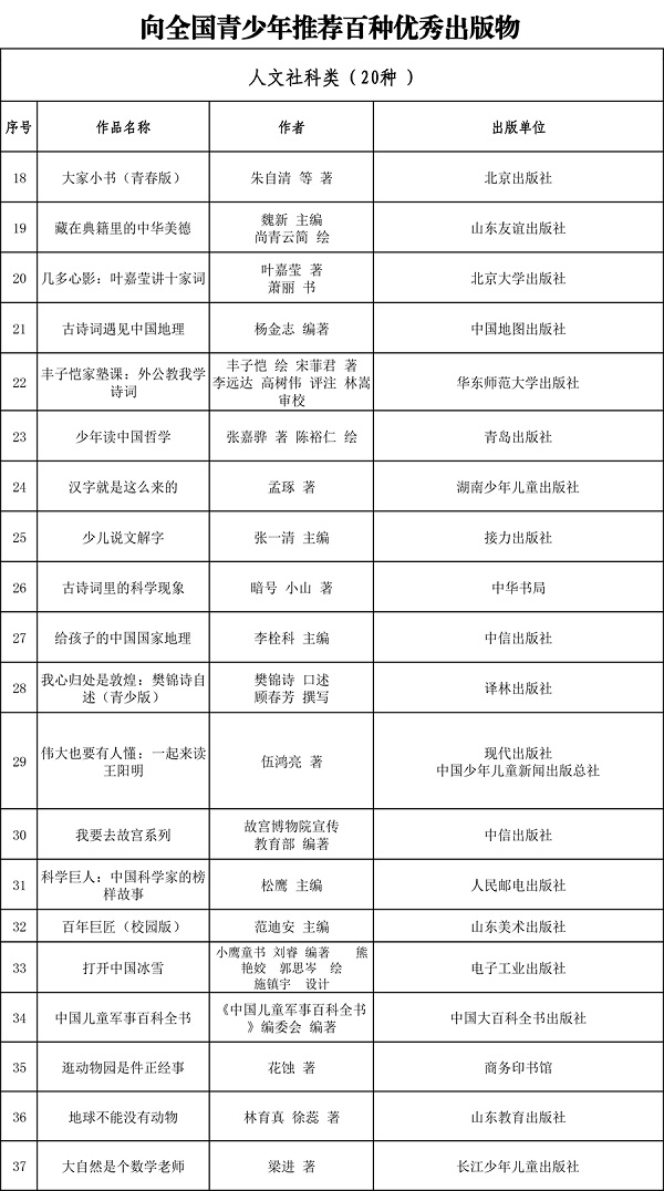 新华社北京4月24日电 为深入学习贯彻习近平新时代中国特色社会主义思想,充分发挥优秀出版物培根铸魂、启智增慧的引领示范作用,中宣部出版局联合全国少工委办公室,会同中国出版协会少年儿童读物工作委员会、中国编辑学会少年儿童读物专业委员会、中国新闻出版广电报社、中国少年报社,开展了向全国青少年推荐百种优秀出版物活动。