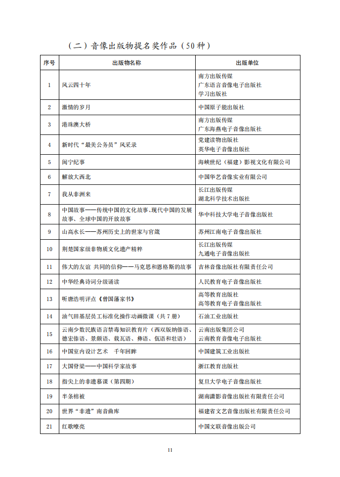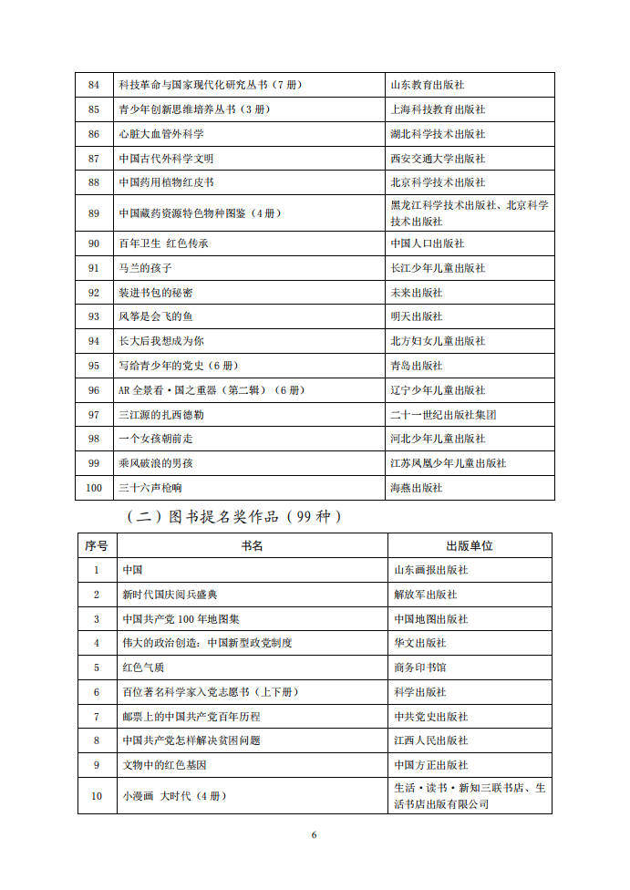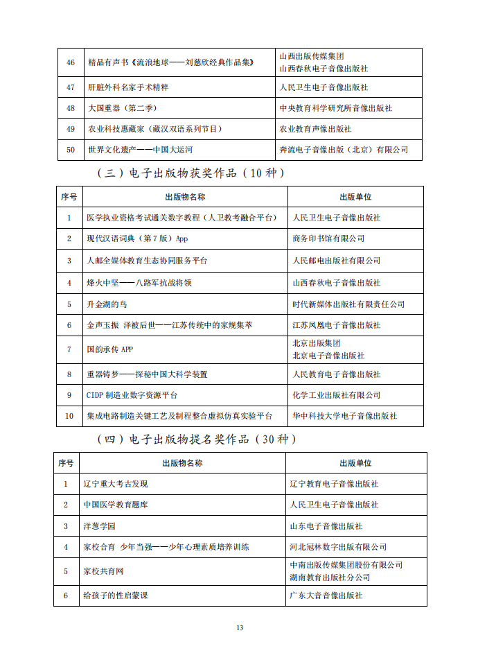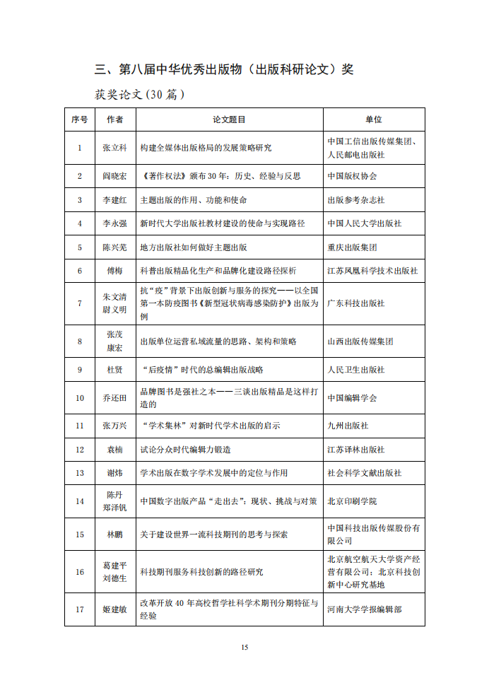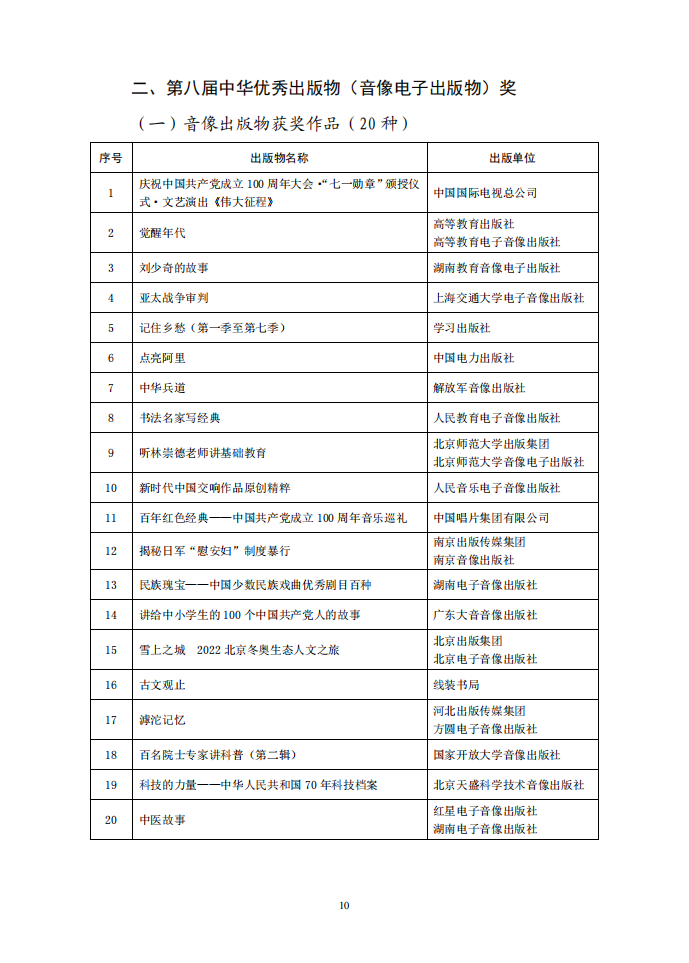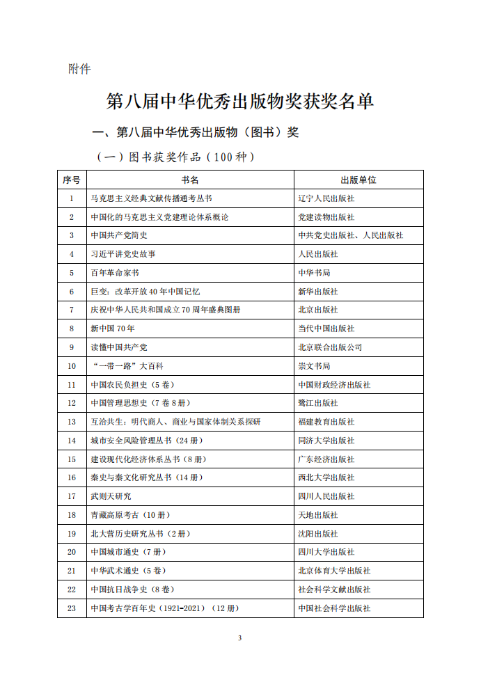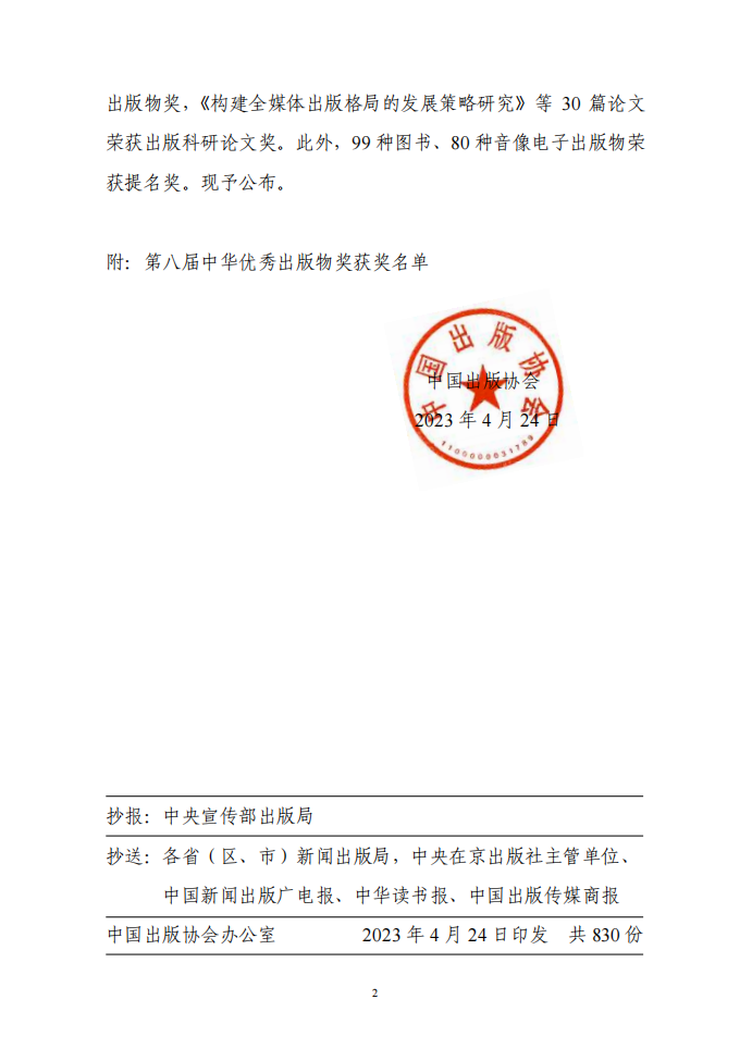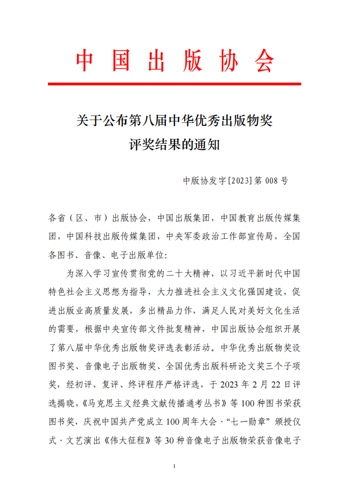 为深入学习宣传贯彻党的二十大精神,以习近平新时代中国特色社会主义思想为指导,大力推进社会主义文化强国建设,促进出版业高质量发展,多出精品力作,满足人民对美好文化生活的需要,根据中央宣传部文件批复精神,中国出版协会组织开展了第八届中华优秀出版物奖评选表彰活动。中华优秀出版物奖设图书奖、音像电子出版物奖、全国优秀出版科研论文奖三个子项奖,经初评、复评、终评程序严格评选,于2023年2月22日评选揭晓,《马克思主义经典文献传播通考丛书》等100种图书荣获图书奖,庆祝中国共产党成立100周年大会·“七一勋章”颁授仪式·文艺演出《伟大征程》等30种音像电子出版物荣获音像电子出版物奖,《构建全媒体出版格局的发展策略研究》等30篇论文荣获出版科研论文奖。此外,99种图书、80种音像电子出版物荣获提名奖。现予公布。