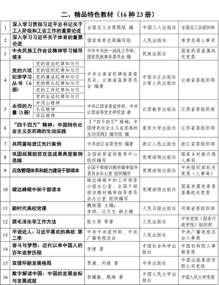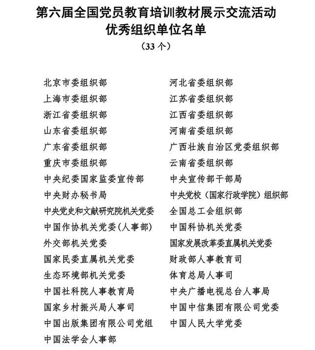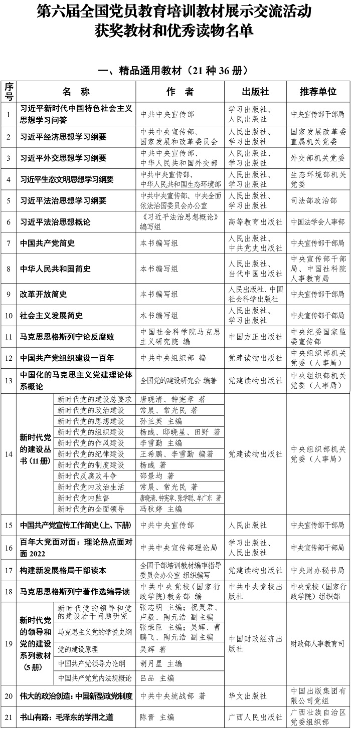省(区、市)党委组织部,副省级城市党委组织部,中央和国家机关部委、人民团体组织人事部门,新疆生产建设兵团党委组织部,中管金融企业党委,国有重要骨干企业党组(党委),高等学校党委等138家单位选送了696种1000册图书。主办方严格按照评审标准和程序,组织了专家评审、基层评价、复核把关等,最终评选出21种精品通用教材、16种精品特色教材,并结合教材评审,为基层党组织和广大党员推荐了92种党员教育培训优秀读物。获奖教材电子版将上传共产党员网(www.12371.cn)和中国国家数字图书馆(www.nlc.cn),供广大党员在线学习。