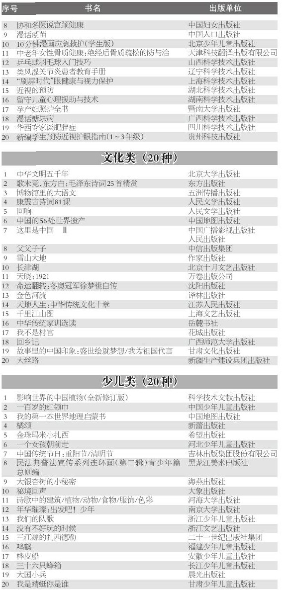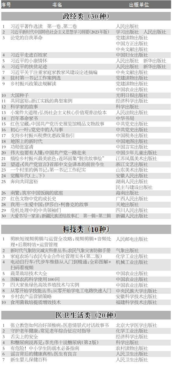 今年的“农民喜爱的百种图书”共有30种政经类图书、10种科技类图书、20种医卫生活类图书、20种文化类图书、20种少儿类图书入选。其中既有《习近平著作选读》第一卷、第二卷,《习近平新时代中国特色社会主义思想学习纲要(2023年版)》等党的创新理论著作和主题出版物,《描绘乡村振兴最美底色:连环画集“脱贫故事绘”》《蔬菜栽培技术大全》等反映乡村振兴成果、帮助农民提升致富技能的优秀图书,也有《一百岁的红领巾》《年华璀璨:出发吧!少年》等引导农村青少年坚定理想信念、厚植爱党爱国爱社会主义情怀的读物,以及《留守儿童心理援助与技术》《舌尖上的安全》等关爱农民群众身心健康、预防疾病滋养心灵的书籍。