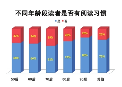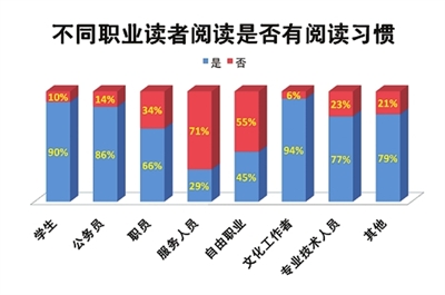 全民阅读的推广,主旨在于推动大众培养良好的阅读习惯。在本次读者调查中显示,71%的读者在平时都有读书看报、上网阅读的良好阅读习惯,与2010年北京地区阅读状况调查数据相持平,而不同年龄层和不同职业的读者在阅读习惯上有一定的差异。其中,“80后”、“90后”的阅读情况最为良好,拥有阅读习惯的读者比例超过平均值,“70后”的读者这一比例较低。在职业方面,文化工作者普遍有着日常阅读习惯,比例高达94%。学生、公务员和专业技术人员也均在平均值之上,而职员、服务人员和自由工作者等读者没有阅读习惯的比重较大。(见图1)