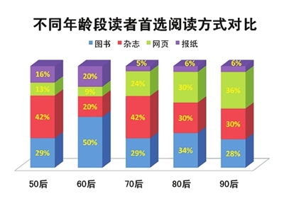 从本中心此次调查数据可见,业余时间首选阅读方式中,虽然图书、杂志仍是首选,分别占总样本量的34%和33%,但首选网页阅读的比例已占到总样本量的22%以上,而首选报纸阅读的比例则已降至11%。不同年龄段对阅读媒介的倾向不同,“90后”首选网页阅读,“80后”首选图书阅读,而“70后”则首选杂志阅读。“50后”、“60后”读者选择阅读报纸的比例明显增加。可见传统报纸的市场需求仍然存在,多数老年人仍主要通过阅读报纸来了解新闻、资讯。(见图3)