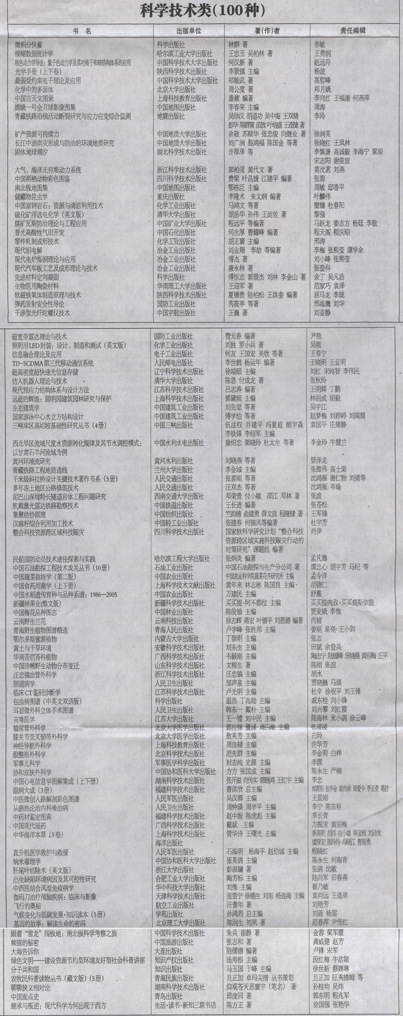 第三届“三个一百”原创图书出版工程入选书目公示(科学技术类100种)