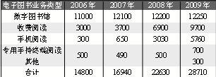 2008年,中国电子图书个人市场开始起步。传统的数字图书馆市场主要面向机构用户,市场收入已经连续数年持平,市场完全饱和。2009年,收费阅读市场实现销售收入9700万元,手机阅读市场实现销售收入5760万元,专用手持式阅读终端市场(内容)收入由2008年的500万以下增长到2009年的700万。