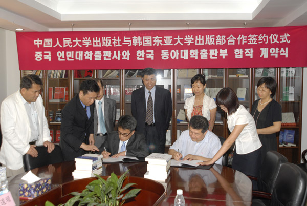 2010年6月25日下午,韩国东亚大学东北亚国际大学院院长郑相喜率团来访人大社,并代表东亚大学出版部部长与人大社签署出版交流与合作意向书。同时,双方就《出版产业研究》、《世界贸易史》两部著作正式签署版权合作协议,人大社授权东亚大学出版部在世界范围内出版发行这两部著作的韩文版。