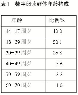 据第八次全国国民阅读调查显示,我国18周岁~70周岁成年人中,2010年进行过数字阅读的人群达到2.525亿人。14周岁~17周岁未成年中,2010年进行过数字阅读的人群达到0.388亿人。从数字阅读主体的年龄分布上来看,18周岁~29周岁的人群占到数字阅读群体的一半以上。其次是30周岁~39周岁,占到1/4以上。具体如表1所示。