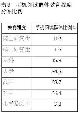 2010年进行过手机阅读的群体中,绝大多数集中在初中和高中学历。就整体而言,手机阅读群体相对集中于中低学历的人群中。具体如表3所示。