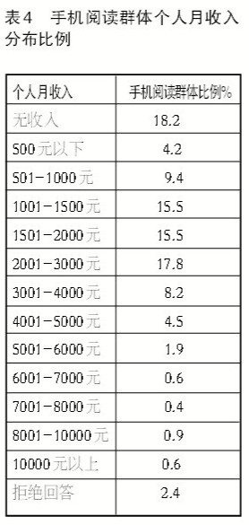3.手机阅读群体中,80%以上用户月收入在3000元以下。