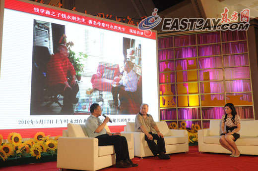 “走近钱学森——纪念钱学森百年诞辰”活动在中央大厅举行 知名作家叶永烈(左一)、钱学森之子钱永刚(中)接受主持人现场访谈
