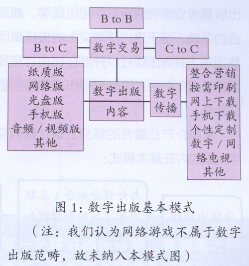 媒介整合与数字出版的两种内在基本模式 媒介融合(Media Corlvergence)的概念最早由美国学者伊契尔·索勒一普尔(ithiel De Sola Pool)于1983年提出,其基本定义为:各种媒介呈现出多功能一体化趋势。另一位美国学者安德鲁-纳奇森(Andfew Nachison)于2006年提出了另一个定义:印刷的、音频的、视频的、互动性数字媒体组织之间的战略的、操作的、文化的合作和联盟。这两个定义中,前者侧重于技术上的融合,后者侧重于产业上的融合。[6][7]我们认为,如果能够将媒介融合的理念引入到对数字出版路径和模式的研究讨论并指导数字出版实践,出版企业或许因此能够找出未来数字出版的一个新思路来。 国内传播学者李智指出,就媒介的技术融合而言,是指各种媒介在信息采集、制作与发布、传送各个环节的技术越来越趋同,进而统一为一体,呈现出多功能一体化的“多媒介性”。比如,随着数字多媒体技术、网络技术和移动通信技术的发展,几乎所有传统媒介的传播特性都被打破和重新聚合,并被接纳或嫁接到互联网或手机等新媒介上。[8]我们将这一认知放到出版业来看,就是,原来的纸质出版只是单纯地通过印刷媒介进行内容传播,而在新媒体出现以后,出版,特别是出版所要传播的内容,从技术层面上讲,其传播途径得到了新的扩展和聚合。出版内容的采集、编辑加工到以某种形式的集成和发布都因为新技术的应用而实现多媒体化和多功能化或称立体化。数字化了的出版内容通过互联网技术、云技术、多媒体技术、移动通讯技术等整合、多媒体化、按不同载体要求进行传播,从而以“多功能性”“多媒介性”的特征呈现。传统纸质出版的内容转化为了数字化出版的内容,出版传播媒介从单纯的纸质图书报刊通过媒介技术融合发展到了网络、终端阅读器、音视频集成、手机等等新型的载体和媒介。具体而言,类似亚马逊的在线阅读和内容下载到Kindle阅读器阅读、苹果公司的Apple Store开放平台和iPhone、iPad等终端设备、中移动浙江阅读基地的内容向移动手机的传输等等,都是数字技术和网络技术融合的表现。 当下业界基本认同的数字出版基本模式图为: