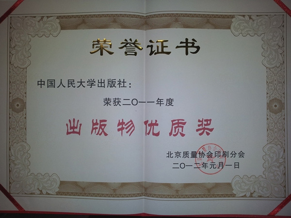 2012年3月21日,由北京质量协会印刷分会、北京市印刷工业产品质量监督检测站共同召集的“2012年质量工作会议”在京召开。会上,人大社荣获“2011年度出版物优质奖” ,196个图书品种被评为“2011年度北京出版物印制优质产品”。