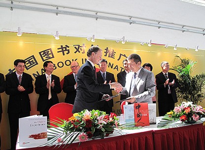 8月29日下午,在北京国际展览中心“中国图书对外推广计划”活动区,中国人民大学出版社与美国麦格劳-希尔教育出版公司联合为《大国竞争的金融战略》(陈雨露)、《世界经济中的中国因素》(黄卫平)、《中国人的价值观》(宇文利)英文版举办了英文版签约仪式,这是中国人民大学出版社与麦格劳-希尔教育出版公司合作出版的“中国经验”系列丛书的第二辑。