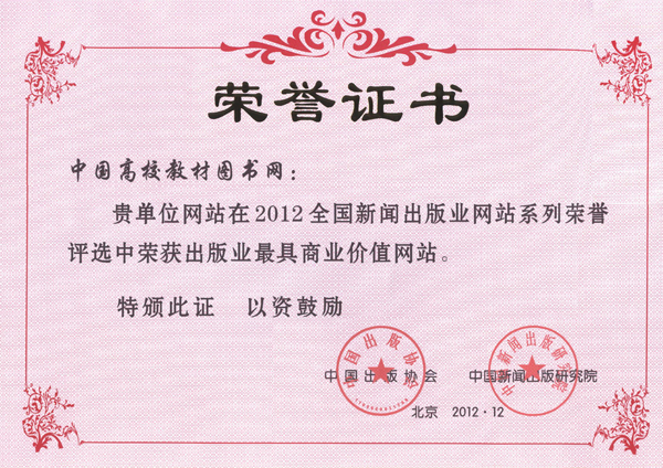 在本届年会上公布了2012年全国新闻出版业网站评选结果,中国高校教材图书网在本次评选中荣获“最具商业价值网站”。这是网站继2009年荣获出版服务网站第5名、2010年荣获“十一五突出成就网站”及2011年荣获“最佳服务网站”之后第四次获奖。