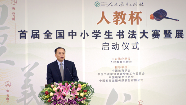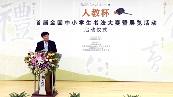 人民教育出版社社长殷忠民在启动仪式上致辞,他对教育部和新闻出版总署对此次大赛的大力支持表示了诚挚的谢意,对许多书法界的专家能够热情、热心、积极参与此次公益活动表示了衷心的感谢。他在发言中还指出:人教社要为社会的发展、为亿万中小学生的成长,贡献力量;人教社要经过这次书法大赛,通过这项公益活动,相对改善现在中小学书法教育薄弱的现状,提高中小学生的素质,为我们新的一代能够写一手好字、写一手美观的字而做出努力。他相信,在社会各界的大力支持下,人教社一定能把这件利国、利民、利教育的好事办好。