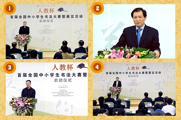 1.中国书法家协会分党组书记、驻会副主席赵长青致辞 2.中国教育出版传媒股份有限公司董事长、总经理李朋义致辞 3.中国教育学会常务副会长、书法教育专业委员会名誉理事长郭振有致辞 4.中国硬笔书法协会主席张华庆致辞
