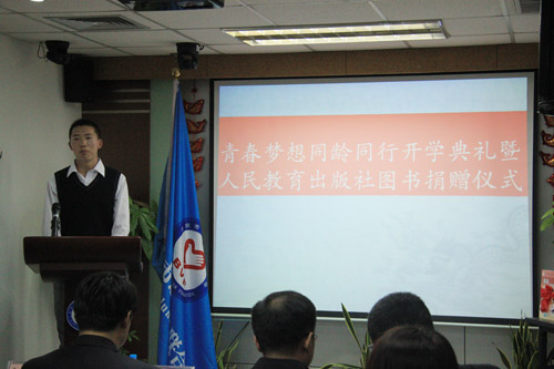 人民教育出版社向该培训项目捐赠教材、图书仪式同时举行。人教社党委书记、副社长郭戈在会上发言,他表示人教社一向重视对教育公益活动的关注和扶持,并将继续对进京务工青年员工志愿培训项目给予支持。据了解,人教社此次为“青春梦想同龄同行”项目捐助了近4万元码洋的教科书,主要包括职业成人教育英语、数学等学科,帮助项目中参加成人高考的学员解决了教科书的问题。