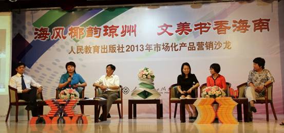 人民教育出版社举办的“海风椰韵琼州文美书香海南──2013市场化产品营销沙龙”,得到了来自全国近百位出版集团、发行集团领导和负责同志热情支持和参与。魏运华同志代表人教教材中心对来宾的到来表示热烈的欢迎,并希望通过沙龙活动增进社店友谊,让各位来宾深入了解人教社市场化产品。在活动现场,人教社总编室主任李俏、少儿编辑室主任刘雅琴、辞书编辑室资深编辑刘玲、大众图书编辑室主任安阳及人教教材中心常务副总经理龙晓君等和与会代表进行了现场交流及微博实时互动,分别就代表和网友关心的教辅质量、教辅版权、学生如何选用字典、《〈3-6岁儿童学习与发展指南〉解读》和新编幼儿园教材的特点,少儿读物和大众图书的出版理念、人教社营销服务品质的提升、数字资源开放和利用等问题进行交流,让与会代表对人教社近期的重点产品有了更多的了解。