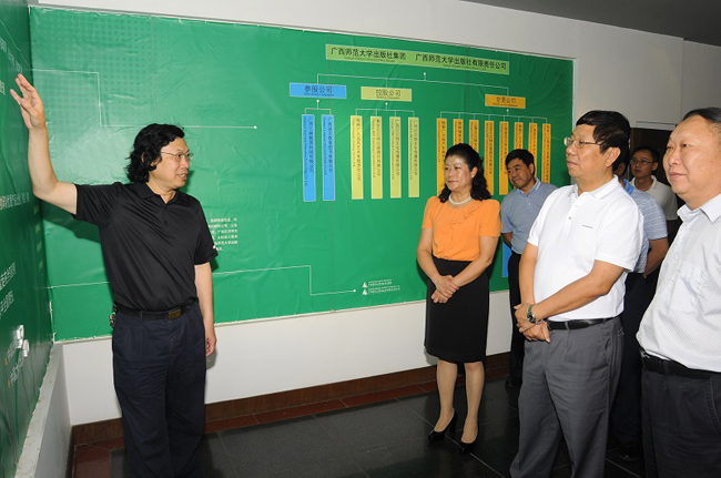 赵乐秦等市委市政府领导参观了广西师大出版社陈列室,并认真听取了广西师大副厅级调研员刘健斌和广西师范大学出版社集团有限公司董事长何林夏、党委书记姜革文等对广西师大出版社改革和发展情况的介绍,对“内涵发展、自我裂变”的“广西师大出版社模式”和出版社所取得的成绩表示肯定。