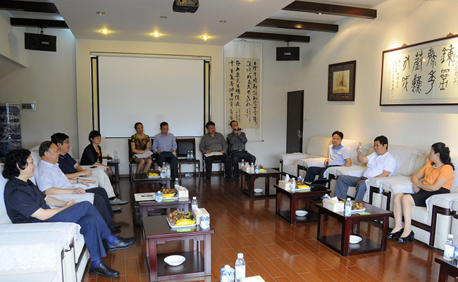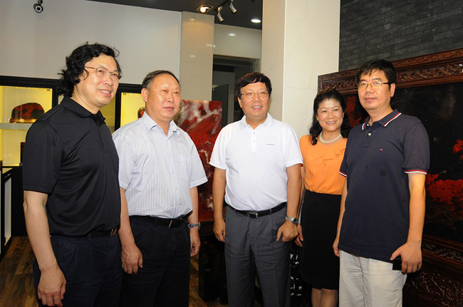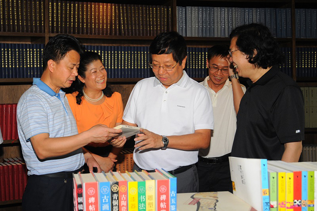 赵乐秦同志(左三)深入了解了出版社目前多元化发展的重点项目,饶有兴致地到广西师范大学出版社集团有限公司旗下的广西状元红艺术馆有限公司视察。