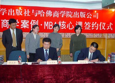 在即将送走2004年之际,中国人民大学出版社在工商管理图书出版合作领域终于以一颗完美的棋子“收官”。11月23日,中国人民大学出版社与哈佛商学院出版公司就合作出版“哈佛商学案例·MBA核心课”举行正式签约仪式,中国人民大学出版社获得授权,将在中国大陆以图书形式独家出版发行哈佛商学案例。通过这次合作,双方在进一步整合哈佛产品线在中国的出版与销售方面又迈出了新的一步。中国人民大学出版社成为惟一一家同时代理哈佛三大产品——《哈佛商业评论》精粹译丛、哈佛商学案例、哈佛网络课堂的出版社,其中《哈佛商业评论》精粹译丛和哈佛商学案例是独家代理。