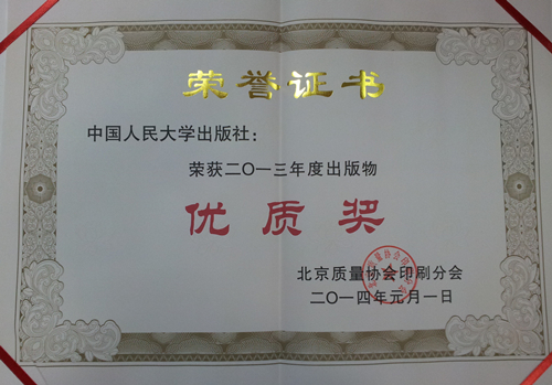 北京印刷质协2014年质量工作会议于2014年4月2日在京召开。根据对会员单位2013年出版物印装质量抽检情况,以及会员单位向北京市印刷工业产品质量监督检测站送检、送评的出版物印装质量情况,中国人民大学出版社荣获“2013年度出版物优质奖”,中国人民大学出版社246个图书品种被评为 “2013年度印刷出版物优质产品”。