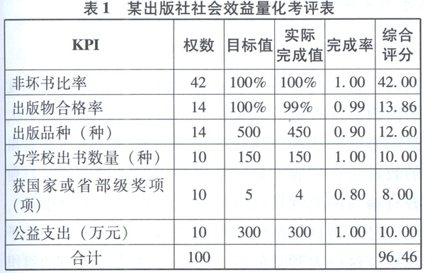 在考评社会效益的关键量化指标中,不出1本坏书是评价出版物内容质量的至关重要的指标。出版社出版的图书如果出现严重质量问题,则会被新闻出版管理部门责令整改,或停业整顿。这不仅会造成经济损失,还会影响学校和出版社自身的声誉。鉴此,应当对“不出坏书”即“非坏书比率”指标赋予较高的权数,一般情况下应高于40,比如可设定为42。此时,“非坏书比率”在考评时的“综合评估值”就只有“42”和“O”两种情况。如果出版社非坏书比率为100%,即没有出1本坏书,则其“综合评分”为42;如果出版了1本坏书,则其“综合评分”为O 。“非坏书比率”的“综合评分”为O时,社会效益考评指标的权数就低于60,则社会效益的考评结果为不合格。此时不管其他绩效指标完成得多么好,出版社整体绩效考评都应当是不合格的,即“非坏书比率”指标具有一票否决的作用。