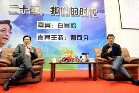 知名主持人曹可凡与白岩松一同出现在签售台。曹可凡对本书做了简要介绍。《一个人与这个时代》是交大出版社策划的“华语名主持人丛书”的开篇之作。全书印刻了白岩松的二十年央视成长记录,将二十年的社会时代史、中国电视新闻发展史、白岩松的个人成长史“三史合一”,该书也成为了第一部带有其自传色彩的著作。随后,白岩松也向读者们冒雨赶来表达深深的感激之情,他表示,在本书之后,众多知名主持人的书也将陆续与大家见面。