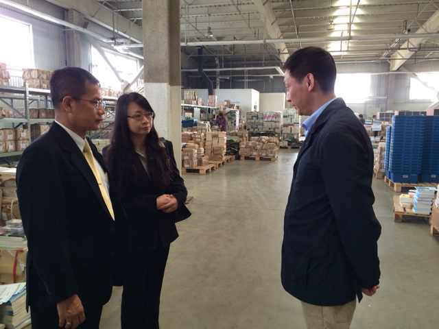 查卫平副总编辑邀请泰方代表团参观了高教社位于大兴的库房,物流部总经理冯拥军对宋玛•米新社长一行到访表示热烈欢迎,并为泰方代表团进行了详细讲解和介绍。泰方对高教社庞大的物流体系表示赞赏,希望可以借鉴成功的运作经验(照片是高教社陪同泰方参观大库时的情景)。