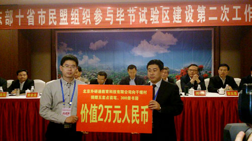 在4月23日的民盟中央“东部十省市民盟组织参与毕节试验区建设第二次工作会议”上,北京外研通教育科技有限公司向贵州省毕节市七星关区干堰小学捐赠了300余册点读图书和五套点读设备,总价值2万余元,帮助该校师生建立了一个“有声图书阅览室”。