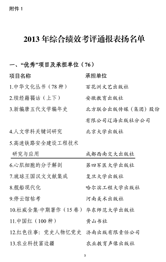 根据《国家出版基金资助项目绩效管理暂行办法》的规定,国家出版基金规划管理办公室对2013年国家出版基金资助的341个已结项目进行了综合绩效考评,经报国家出版基金管理委员会批准,对被评为优秀的76个项目的承担单位进行通报表扬,并给予其中26个项目承担单位增加2015年度国家出版基金申报项目1项的奖励。西南交大出版社的《高速铁路安全建设工程技术研究与应用》,在项目实施中标准严格、确保质量、责任落实、保证进度、制度健全、资金使用规范,取得了第五名的优异成绩。