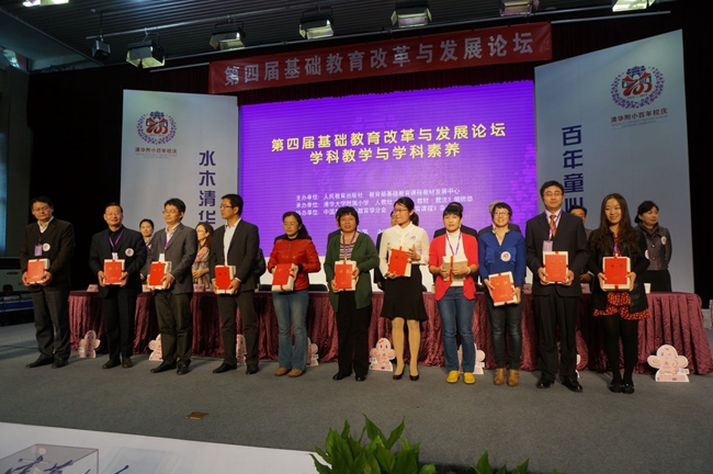 由人民教育出版社和教育部基础教育课程教材发展中心主办、《课程·教材·教法》编辑部和清华大学附属小学承办、中国教育学会教育学分会和《基础教育课程》杂志社协办的第四届“基础教育改革与发展论坛”于10月17-18日在北京清华附小成功召开。教育部基础教育二司副司长申继亮,中国教育出版传媒集团董事长杨光,教育部基础教育课程教材发展中心主任田慧生、副主任刘月霞,人民教育出版社总编辑韦志榕、党委书记郭戈、副总编辑魏运华,清华大学副校长姜胜耀、清华附小校长窦桂梅,北京市朝阳区教委副书记刘丽彬、石景山区教委副主任聂晶,以及来自全国各地的900多位中小学校长、教师、教研员,基础教育管理者,师范院校师生,以及科研院所的研究人员参加了论坛活动。