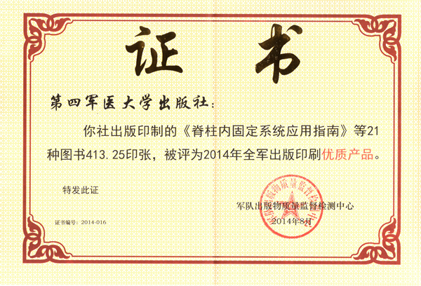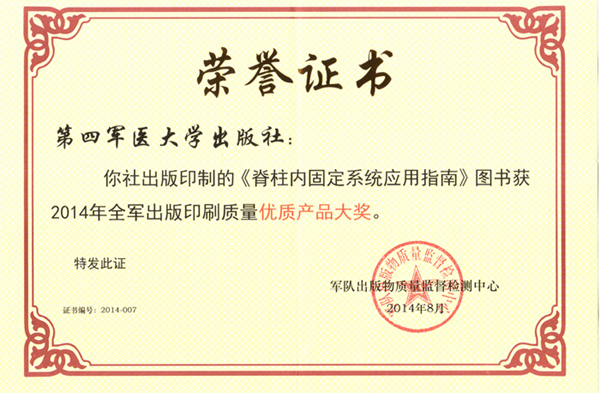在军队出版社2014年度图书质量检查评比活动中,第四军医大学出版社报送的21种图书全部荣获“2014全军出版印刷优质产品”奖。其中《脊柱内固定系统应用指南》一书荣获2014全军出版印刷质量最高奖——“优质产品大奖”。